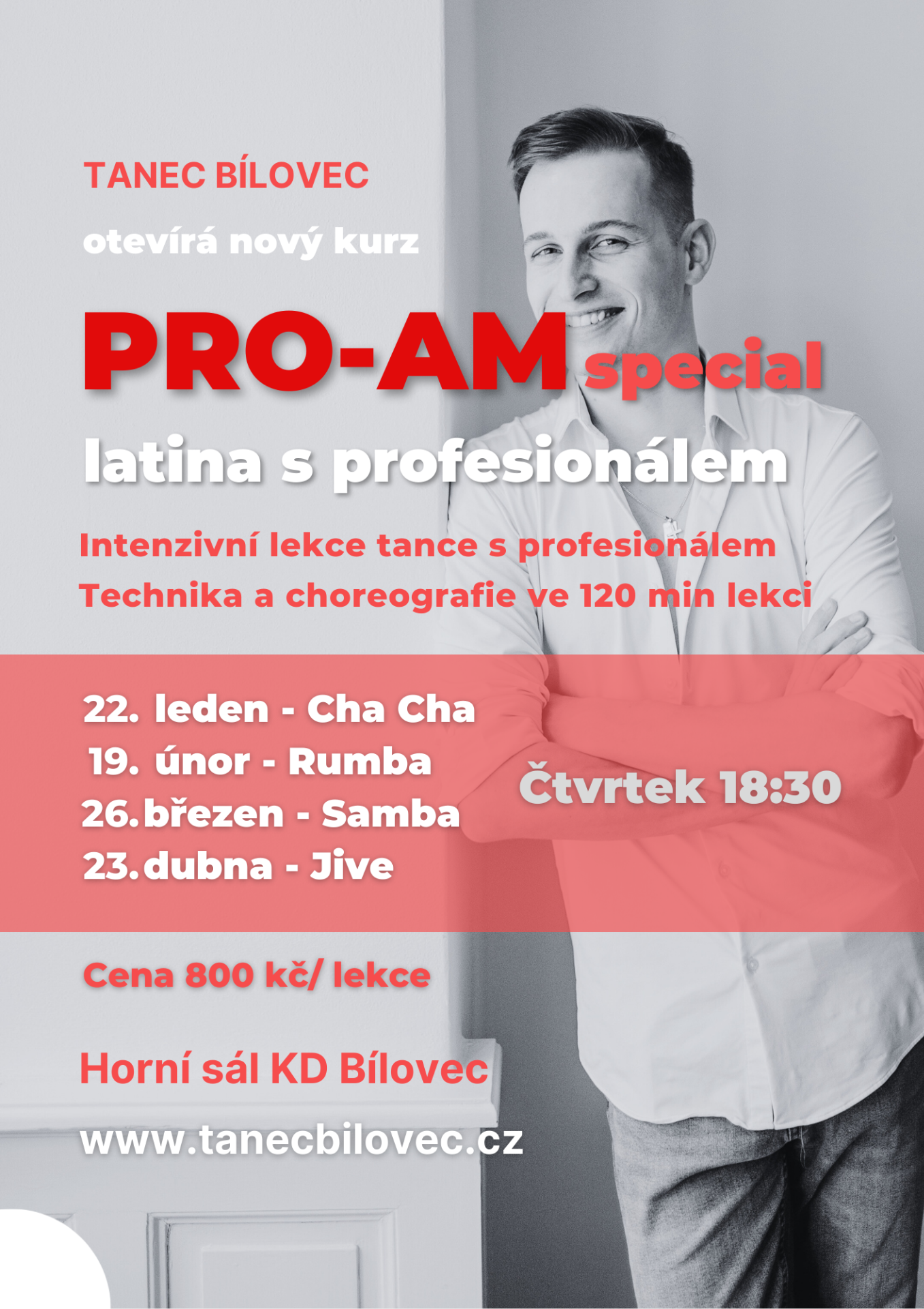 Tanec Bílovec otevírá intenzivní kurz pro všechny dámy, které si chtějí vyzkoušet PRO-AM formát tance s profesionálním partnerem. Každá lekce trvá 120 minut, abychom měli dostatek času vše si vysvětlit, vyzkoušet a opravdu protančit.